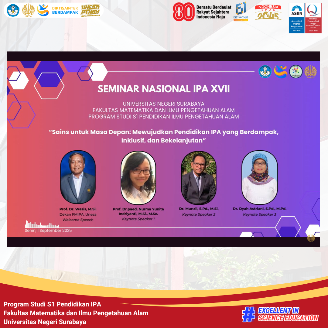 Surabaya - Seminar Nasional IPA 2025 kembali digelar pada Senin, 1 September 2025 secara daring melalui Zoom dan disiarkan langsung di kanal YouTube Pendidikan IPA FMIPA UNESA. Acara ini menjadi ruang akademik penting yang mempertemukan peneliti,