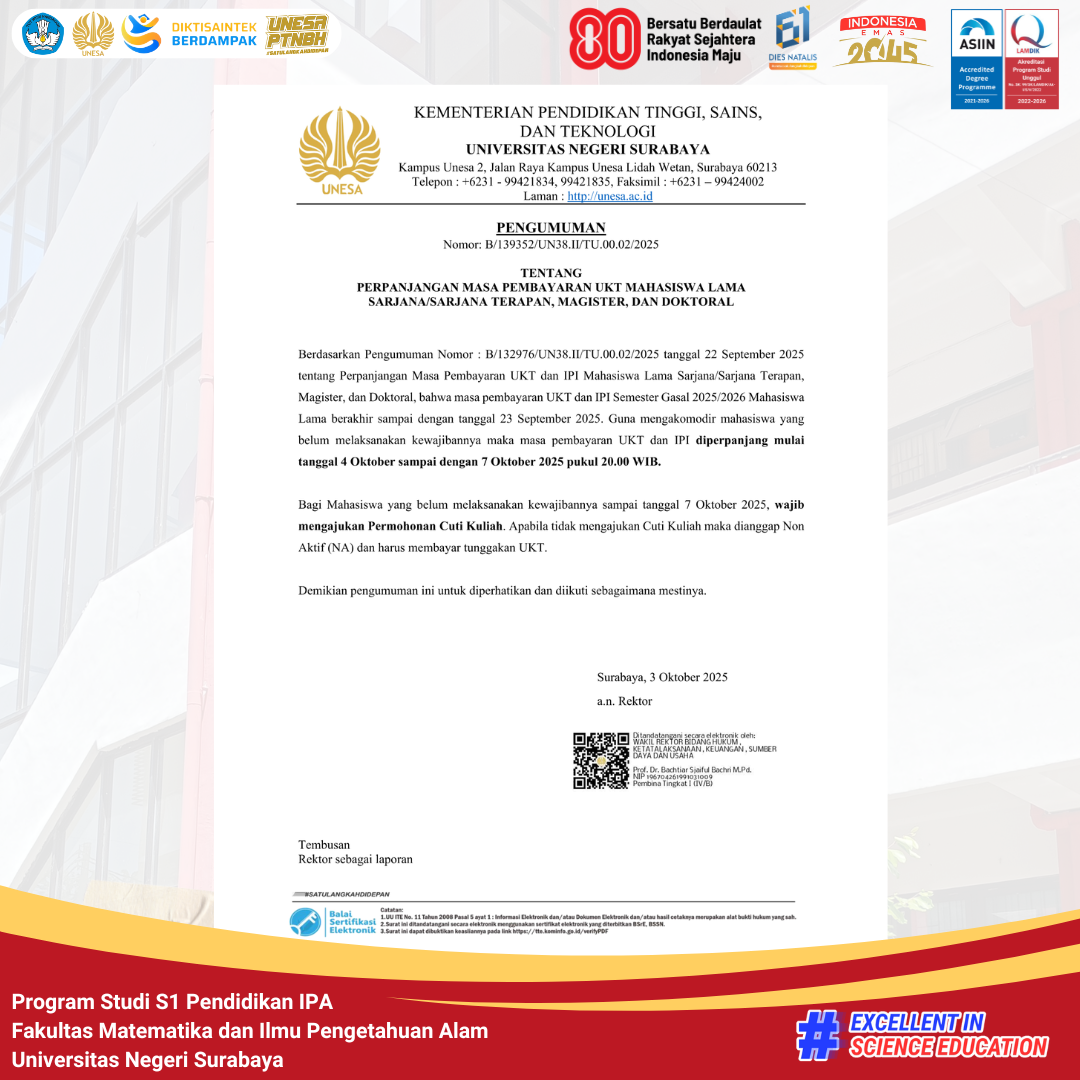 Surabaya - Universitas Negeri Surabaya (UNESA) melalui surat resmi Nomor: B/128348/UN38.II/TU.00.02/2025 mengumumkan bahwa masa pembayaran Uang Kuliah Tunggal (UKT) dan Iuran Pengembangan Institusi (IPI) bagi mahasiswa lama jenjang Sarjana, Sarja