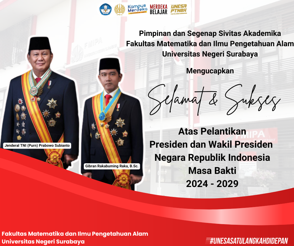 Surabaya - Seluruh Sivitas Akademika Fakultas Matematika dan Ilmu Pengetahuan Alam (FMIPA) Universitas Negeri Surabaya (Unesa) mengucapkan selamat kepada Bapak Jenderal TNI (Purn) Prabowo Subianto dan Bapak Gibran Rakabuming Raka, B.Sc. atas pela
